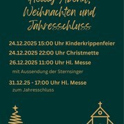 Das Jahr 2025 neigt sich dem Ende zu. Anbei finden Sie eine Übersicht über die Feierlichkeiten zu Heilig Abend, den Weihnachtstagen und zum Jahresschluss. lesen Sie mehr...22.12.2025